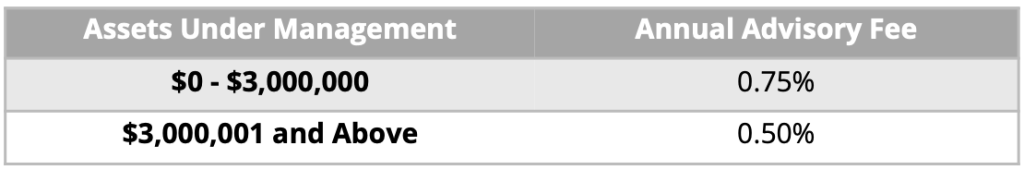 My annual fee starts at 0.75% for the first $3 million under management and decreases to 0.50% on the remaining balance per the schedule below. The minimum account size requirement is $100,000 which may be reduced or waived on a case-by-case basis. After the first year, investment management clients with at least the minimum account size in managed assets receive ongoing personal financial planning support and updates to their plan at no additional cost.